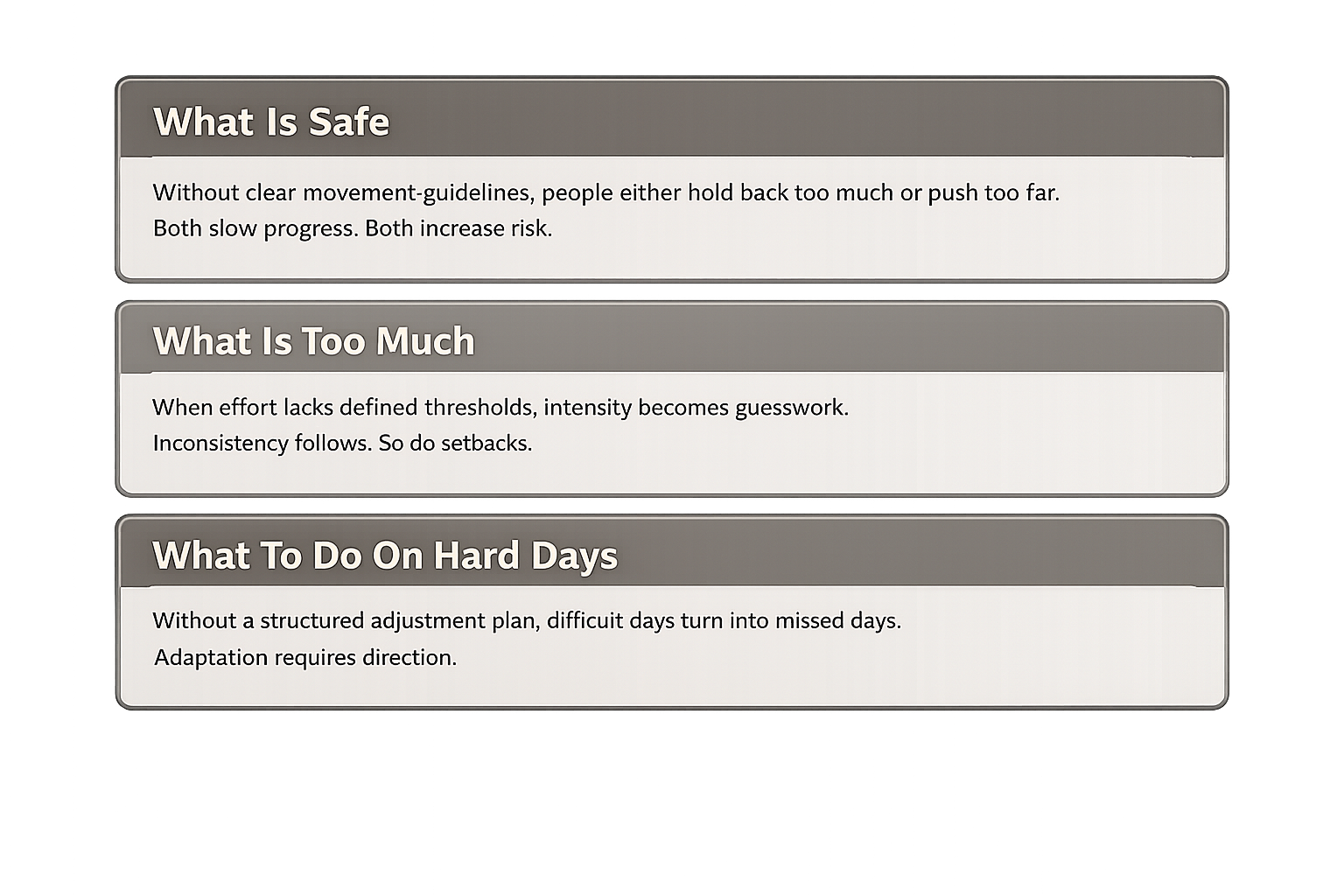 Clear, progressive movement guidelines engineered for long term sustainability, not short term intensity spikes.