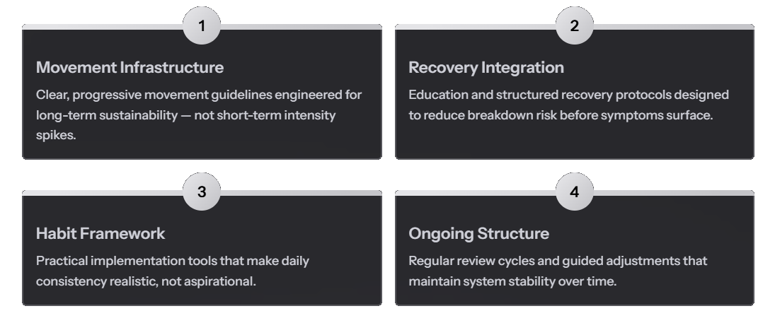 A structured support framework designed to operate between care, training, and daily life. Resilient Health doesn't sell workouts or short-term plans. We implement systems built around four core components.